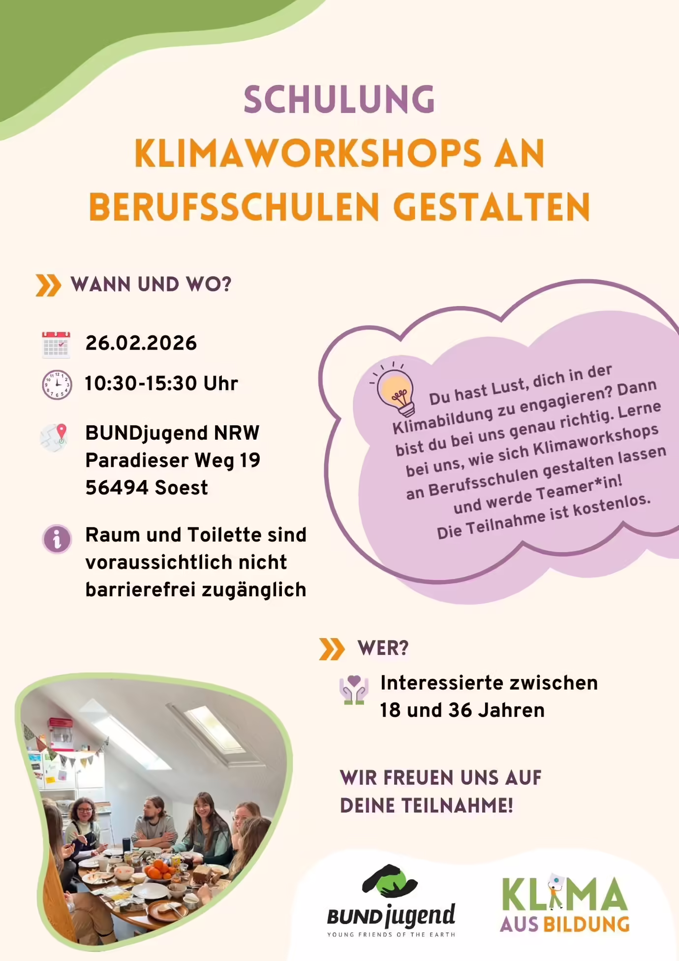 Du hast Interesse? Dann schick einfach eine kurze Mail an ed.wrn-dnegujdnub@ofni und komm vorbei!